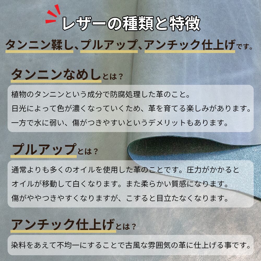 →植物のタンニンという成分を使用して防腐処理した革のこと。日光などによって色が濃くなっていくため、革を育てる楽しみがあります。一方で水に弱い(水ジミになりやすい)というデメリットもあります。