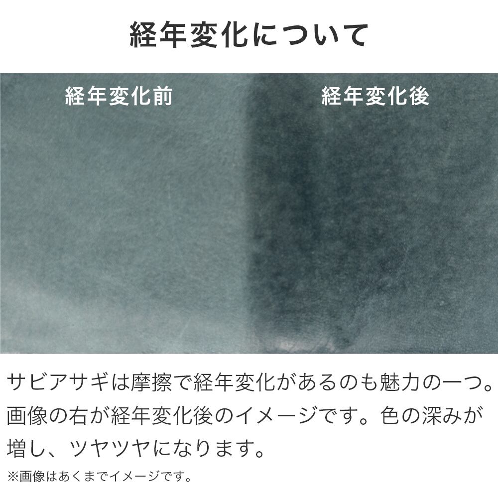 サビアサギは摩擦で経年変化があるのも魅力の一つ。 画像の右が経年変化後のイメージです。色の深みが 増してツヤツヤになります。